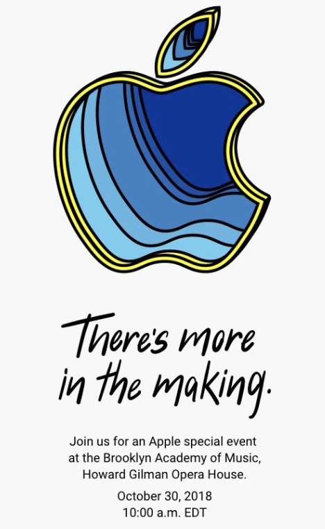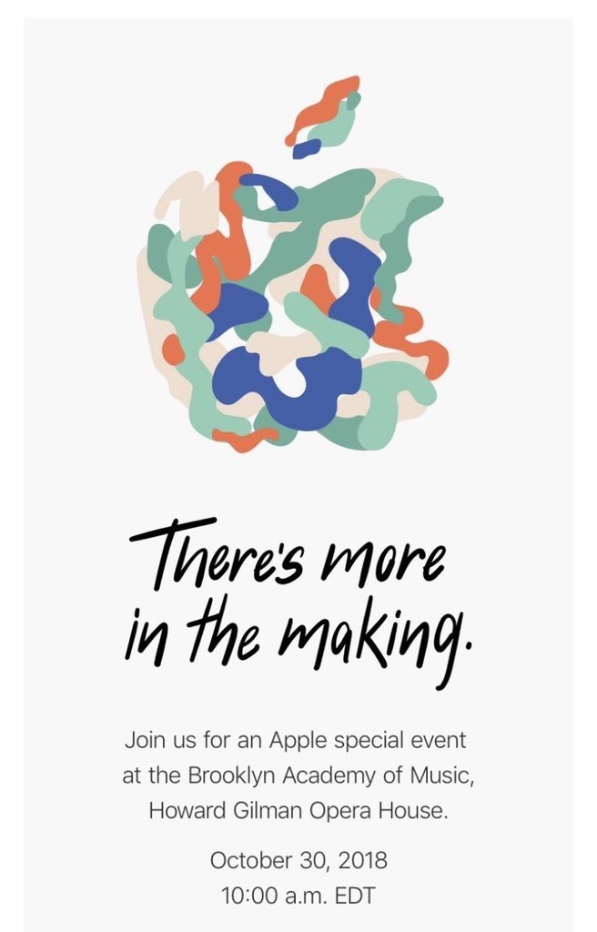 Apple เตรียมจัดอีเวนท์ในวันที่ 30 ตุลาคม 2018 นี้ ณ Brooklyn Academy of Music ที่กรุงนิวยอร์ก ประเทศสหรัฐอเมริกา โดยทาง Apple ได้ปล่อยภาพทีเซอร์เชิญร่วมงาน ดังที่ปรากฏด้านล่างนี้
